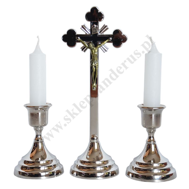 Metalowy komplet kolędowy składający się z krzyżyka, dwóch lichtarzyków oraz dwóch świec. Komplet zapakowany w kartonowe pudełko.