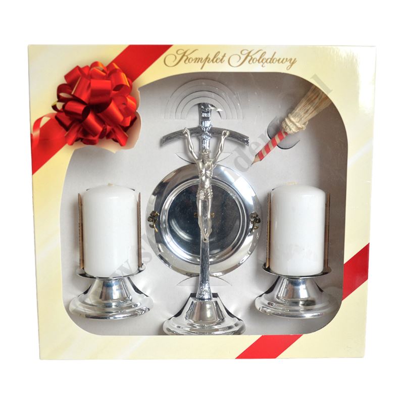 Metalowy komplet kolędowy składający się z krzyżyka, dwóch lichtarzyków, dwóch świec, talerzyka na wodę święconą oraz kropidełka. Komplet zapakowany w kartonowe pudełko.