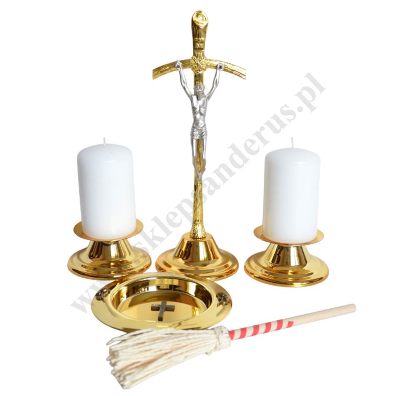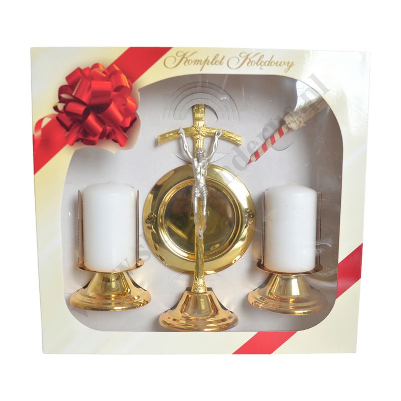 Metalowy komplet kolędowy składający się z krzyżyka, dwóch świeczników, dwóch świeczek, talerzyka na wodę święconą oraz kropidełka. Komplet zapakowany w kartonowe pudełko.