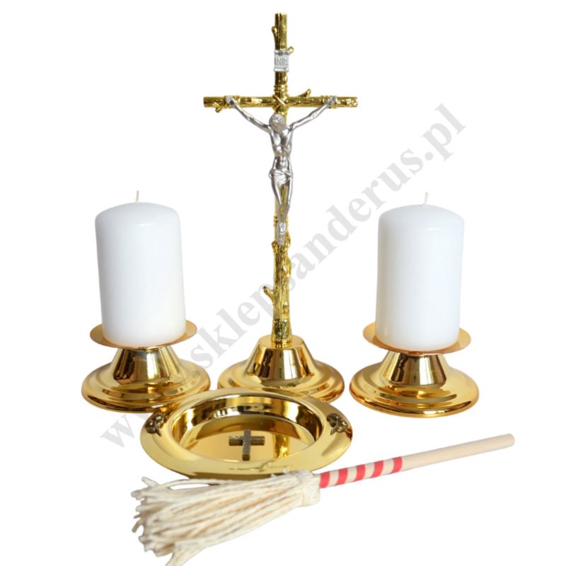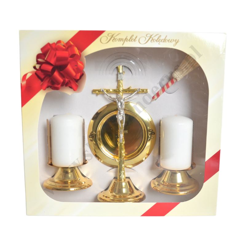 Metalowy komplet kolędowy składający się z krzyżyka, dwóch świeczników, dwóch świeczek, talerzyka na wodę święconą oraz kropidełka. Komplet zapakowany w kartonowe pudełko.