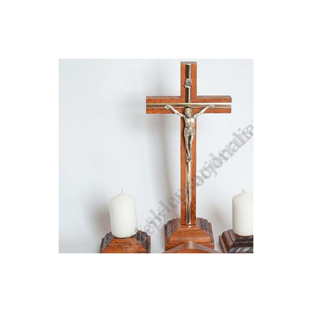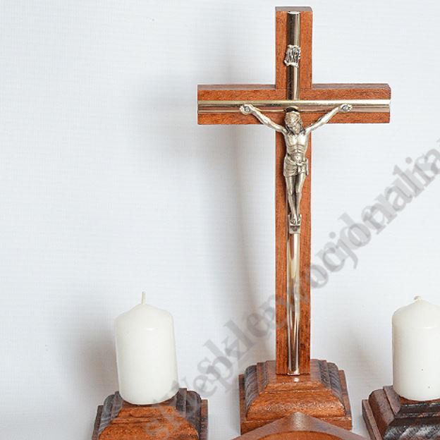 Drewniany komplet kolędowy zawierający krzyżyk, świeczniki, świeczki, miseczkę na wodę święconą oraz kropidło.