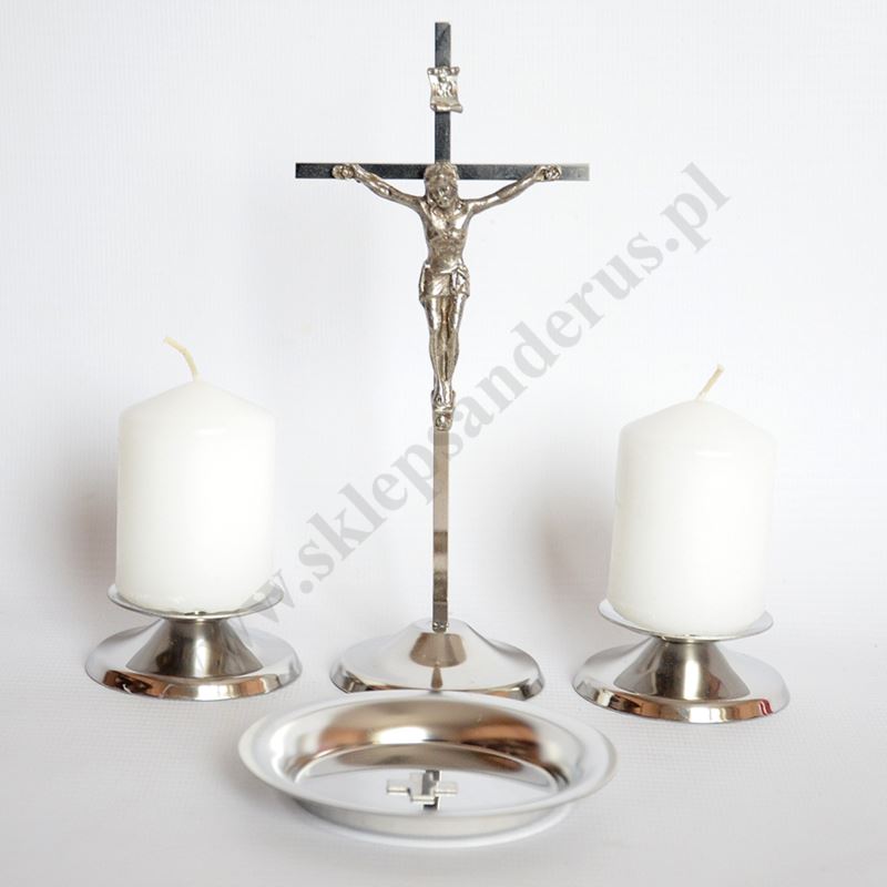 Metalowy komplet kolędowy, ze stali nierdzewnej, który składa się z krzyżyka, dwóch świeczników, dwóch świeczek oraz miseczki na wodę święconą. Komplet zapakowany w kartonowe pudełko.