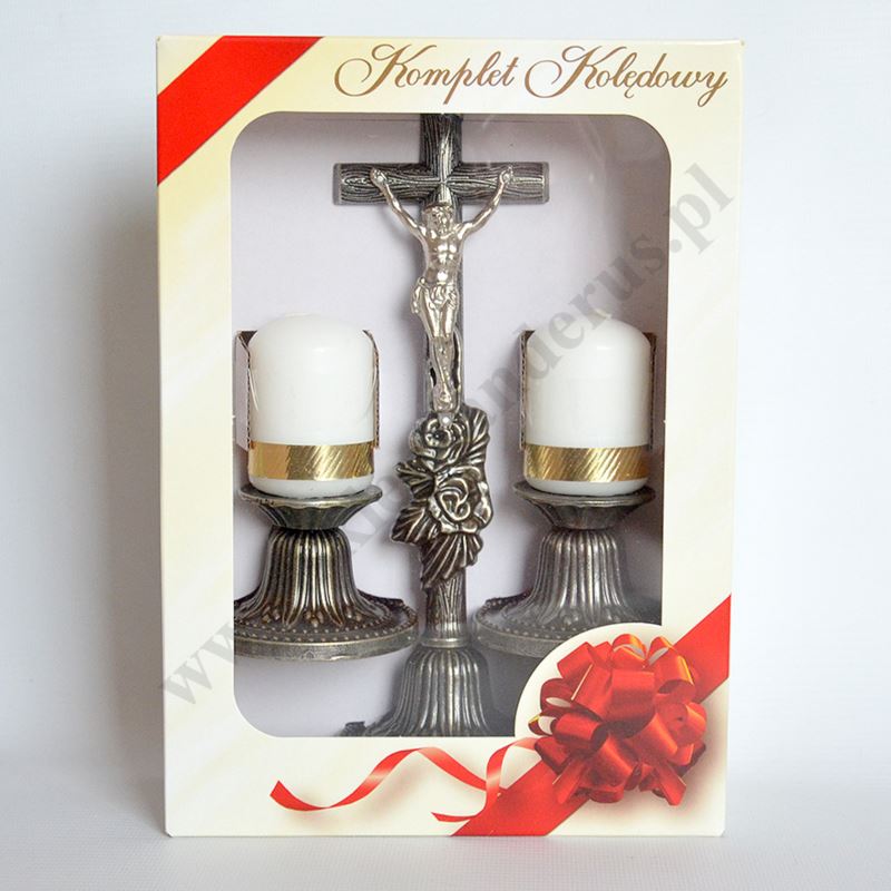 Metalowy komplet kolędowy składający się z krzyżyka, dwóch lichtarzyków oraz dwóch świec. Komplet zapakowany w kartonowe pudełko.