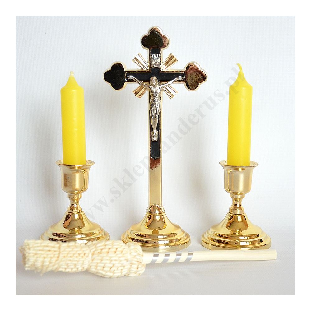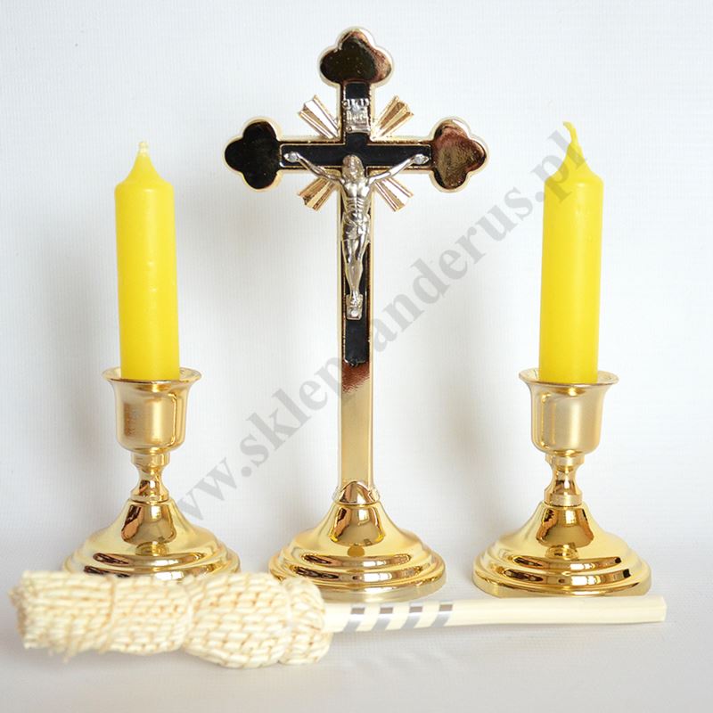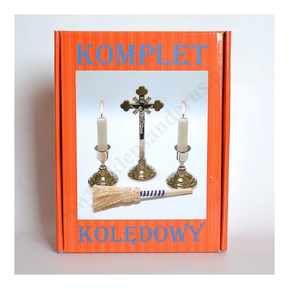 Metalowy komplet kolędowy składający się z krzyżyka, dwóch lichtarzyków, dwóch świec oraz kropidełka. Komplet zapakowany w kartonowe pudełko.
