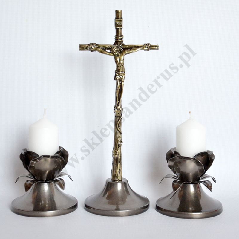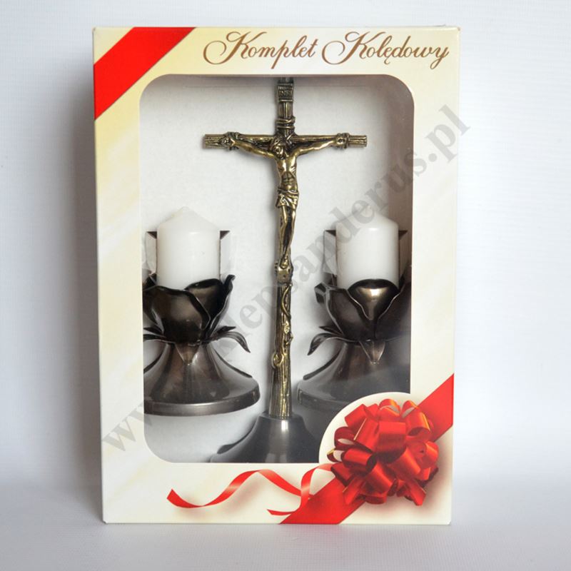 Metalowy komplet kolędowy zawierający krzyżyk, dwa lichtarzyki oraz dwie świeczki. Komplet zapakowany w kartonowe pudełko.