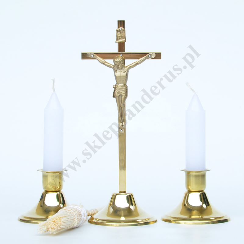 Komplet kolędowy wykonany z blachy mosiężnej składający się z krzyżyka, dwóch lichtarzyków, dwóch świeczek oraz kropidła wiórkowego. Komplet zapakowany w kartonowe pudełko.