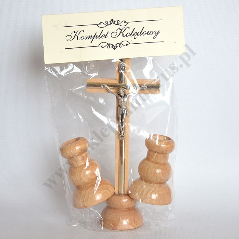 Drewniany komplet kolędowy zawierający: krzyżyk oraz dwa świeczniki.