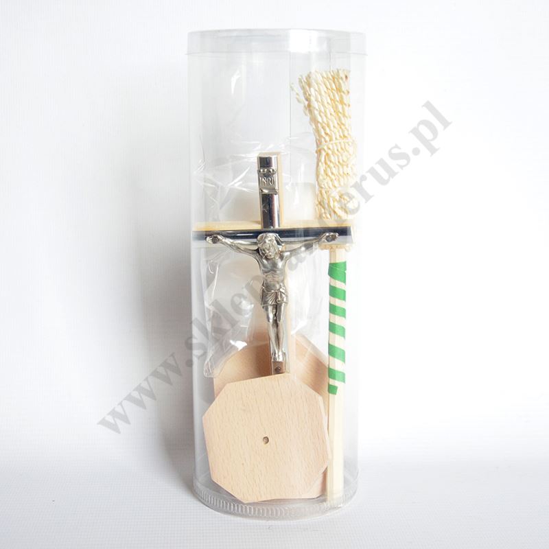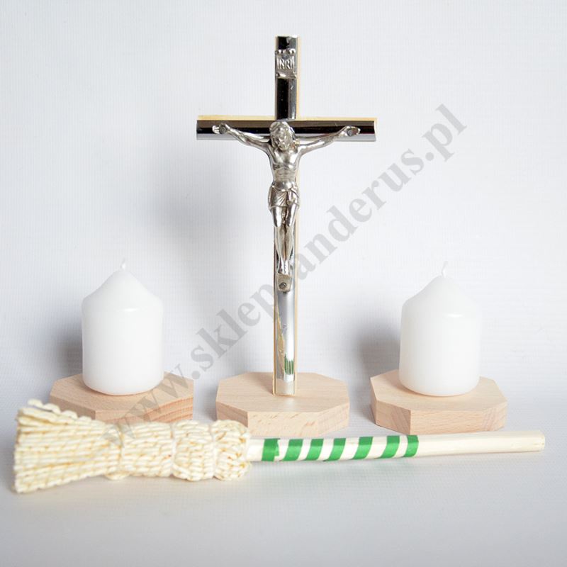 Komplet kolędowey drewniany składający się z krzyżyka z wstawką metalową, dwóch święczników, dwóch świec oraz kropidełka. Komplet zapakowany w przezroczystą tubę z tworzywa sztucznego.