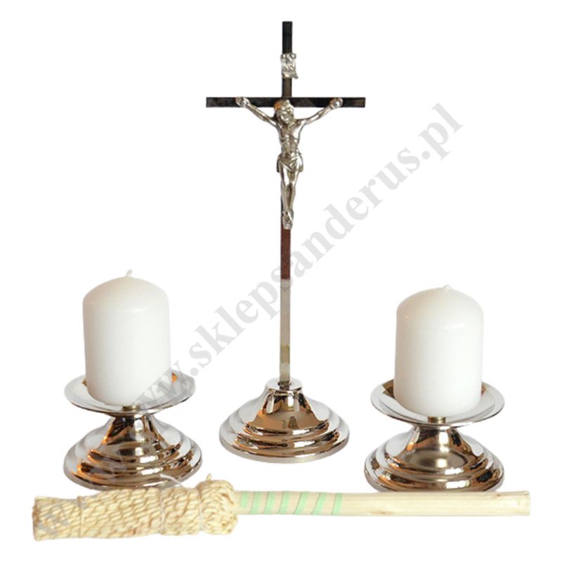 Komplet kolędowy nowoczesny w kolorze srebrnym, wysokość krzyża 20 cm, w zestawie ze świeczkami oraz kropidełkiem.