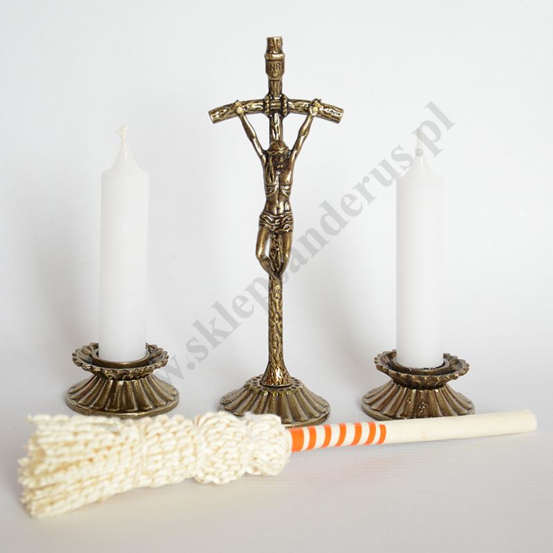Metalowy mały komplet kolędowy, papieski w kolorze starego złota. W komplecie znajduje się krzyżyk, dwa lichtarzyki, dwie świeczki oraz kropidło. Komplet zapakowany w kartonowe pudełko.