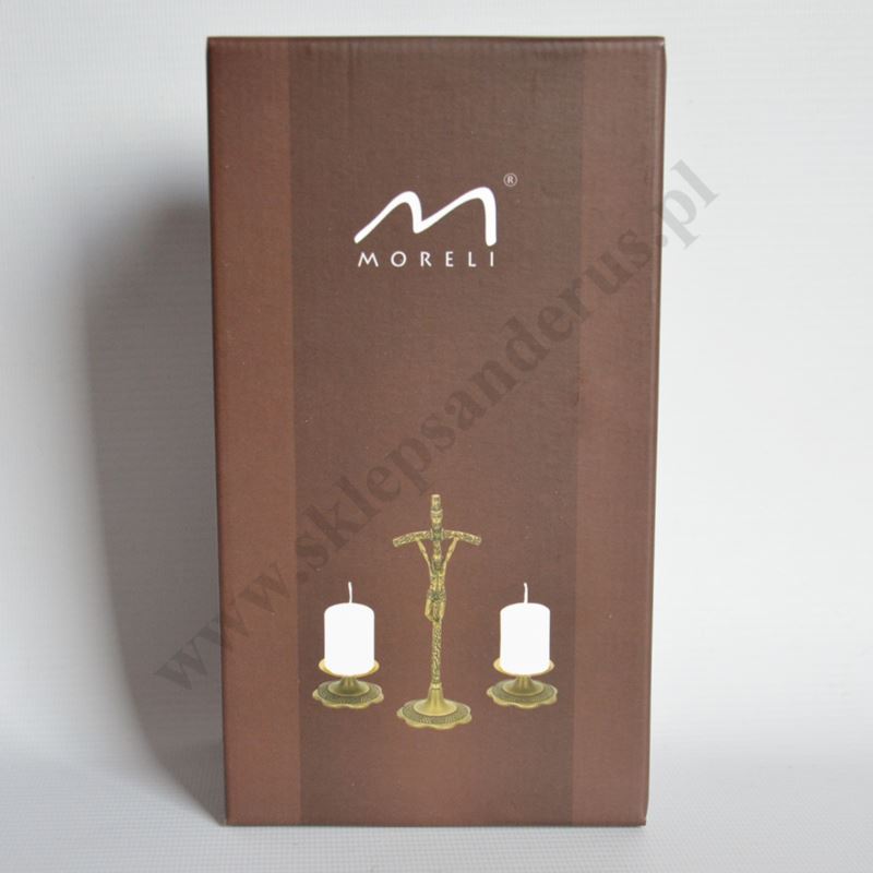 Metalowy komplet kolędowy, składający się z krzyżyka papieskiego, dwóch świeczników oraz dwóch świeczek. Komplet zapakowy jest w eleganckie, kartonowe pudłeko.
