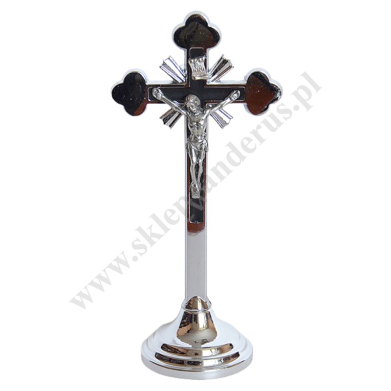 Krzyż stojący metalowy tradycyjny o wysokości 19 cm i rozpiętości ramion 9 cm.