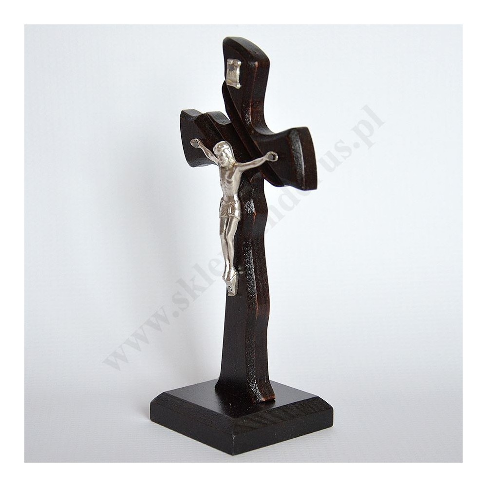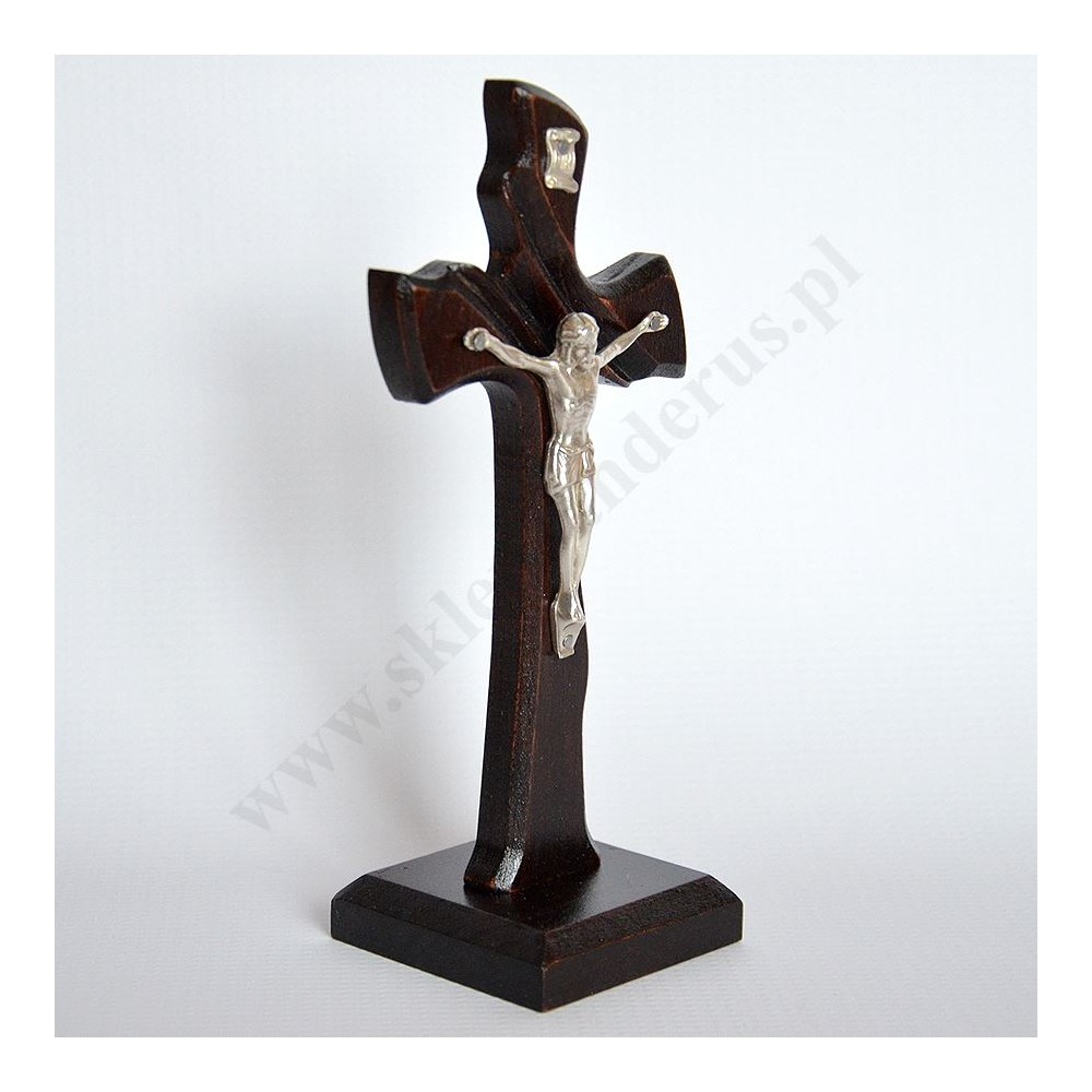 Drewniany krzyżyk stojący z metalowym korpusem Pana Jezusa. Wysokość krzyżyka 17.5 cm, szerokość 8.4 cm.