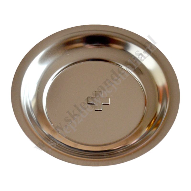 Metalowa miseczka na wodę święconą o średnicy 11.5 cm i wysokości 1.4 cm.
