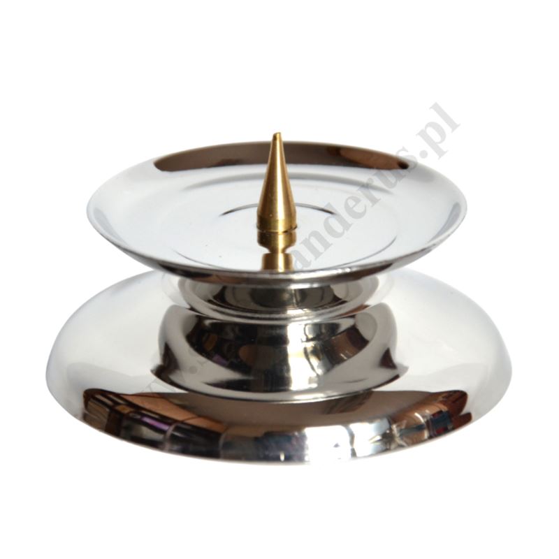 Świecznik metalowy o wysokości 2.3 cm, średnicy podstawy 5.9 cm i średnicy talerzyka 4.7 cm.