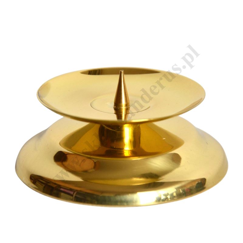 Świecznik wykonany z blachy mosiężnej o wysokości 2.5 cm, średnica talerzyka pod świece 5.4 cm, średnica podstawy 6.9 cm.