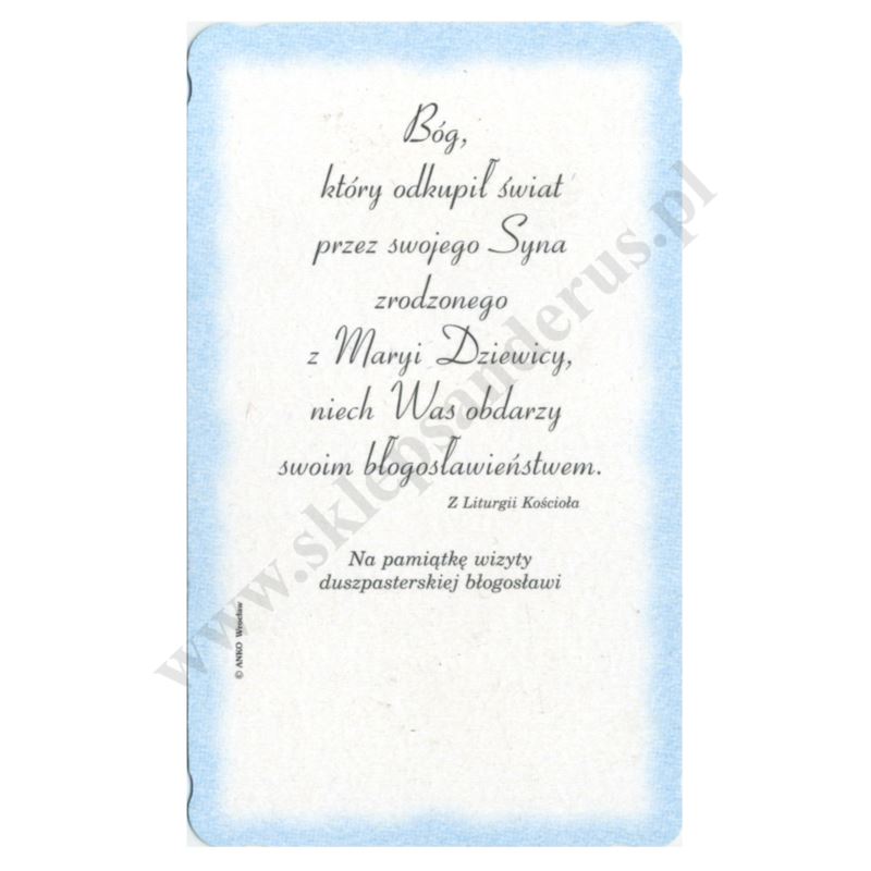 Obrazek kolędowy lakierowany oraz brokatowany wymiarach 10.4 cm x 6.2 cm. Na rewersie obrazka pamiątkowy tekst. W paczce znajduje się 100 szt. obrazków jednego wzoru. Sprzedaż na paczki po 100 szt.