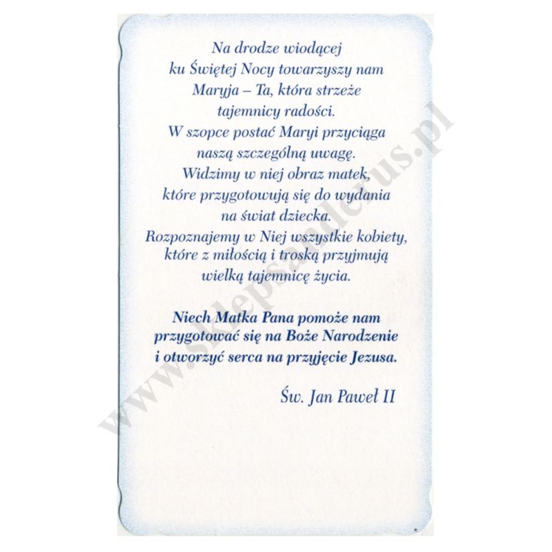 Obrazek kolędowy lakierowany oraz brokatowany wymiarach 14.7 cm x 8.9 cm. Na rewersie obrazka pamiątkowy tekst. W paczce znajduje się 100 szt. obrazków jednego wzoru. Sprzedaż na paczki po 100 szt.