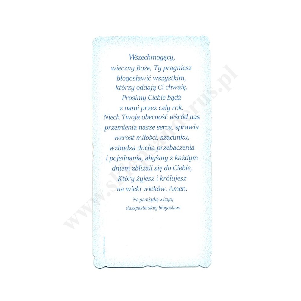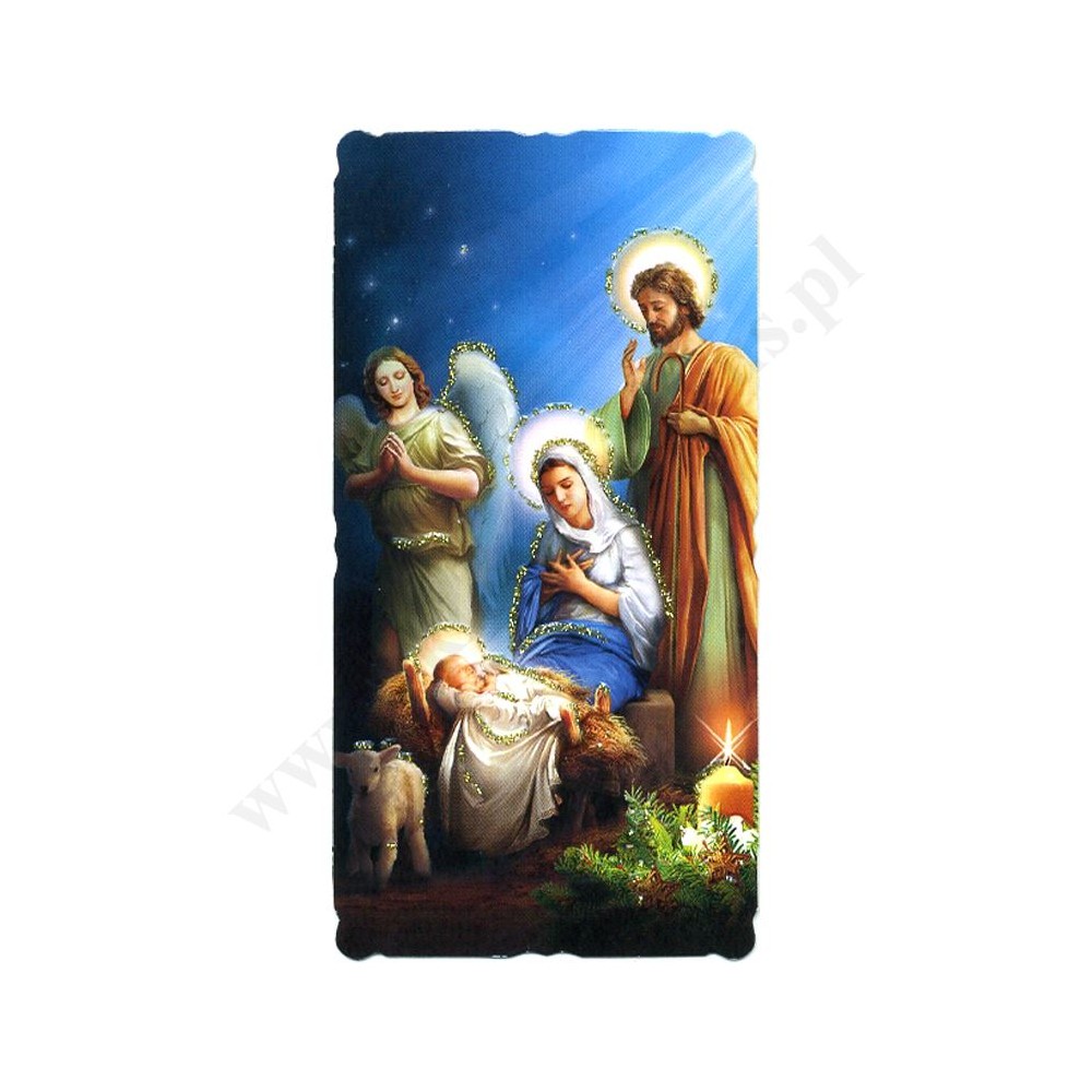 Obrazek kolędowy lakierowany, zdobiony brokatem o wymiarach 5.4 cm x 10,5 cm. Na rewersie obrazka pamiątkowy tekst. W paczce znajduje się 100 szt. obrazków jednego wzoru. Sprzedaż na paczki po 100 szt.