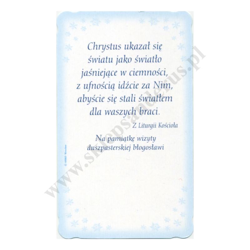 Obrazek kolędowy lakierowany oraz brokatowany wymiarach 6.2 cm x 10.4 cm. Na rewersie obrazka pamiątkowy tekst. W paczce znajduje się 100 szt. obrazków jednego wzoru. Sprzedaż na paczki po 100 szt.