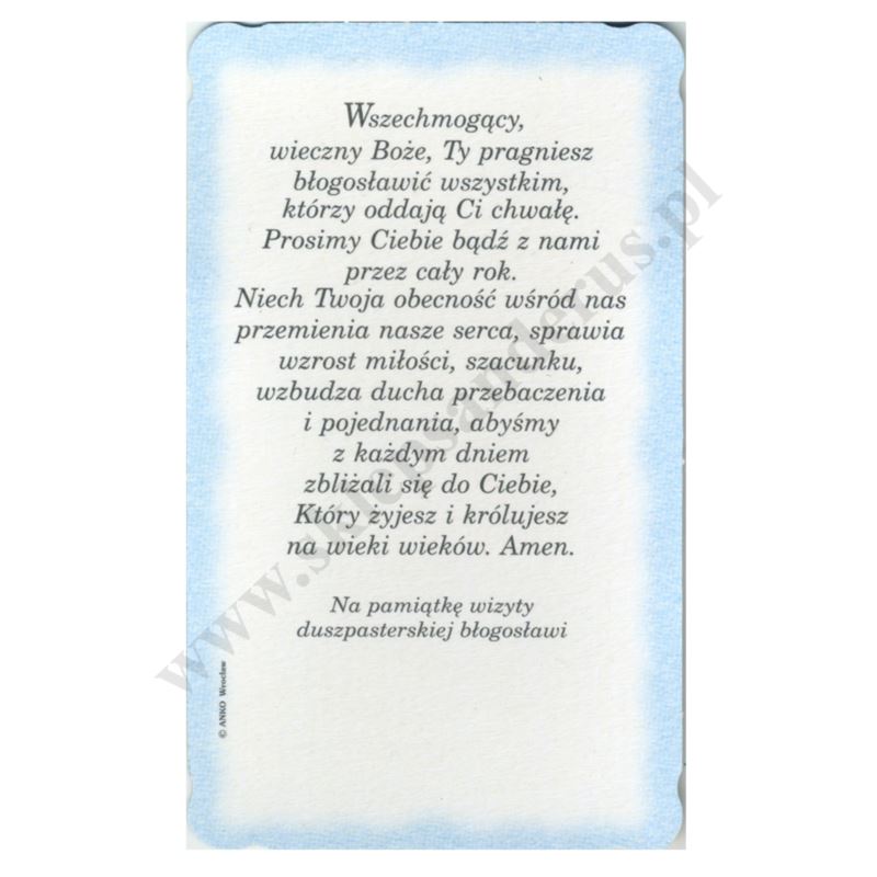 Obrazek kolędowy lakierowany oraz brokatowany wymiarach 6.2 cm x 10.4 cm. Na rewersie obrazka pamiątkowy tekst. W paczce znajduje się 100 szt. obrazków jednego wzoru. Sprzedaż na paczki po 100 szt.