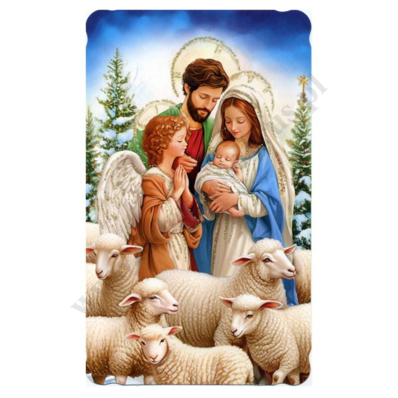 Obrazek kolędowy lakierowany, zdobiony brokatem w formacie pocztówki o wymiarach 8.9 cm x 14.7 cm. Na rewersie obrazka pamiątkowy tekst. W paczce znajduje się 100 szt. obrazków jednego wzoru. Sprzedaż na paczki po 100 szt.