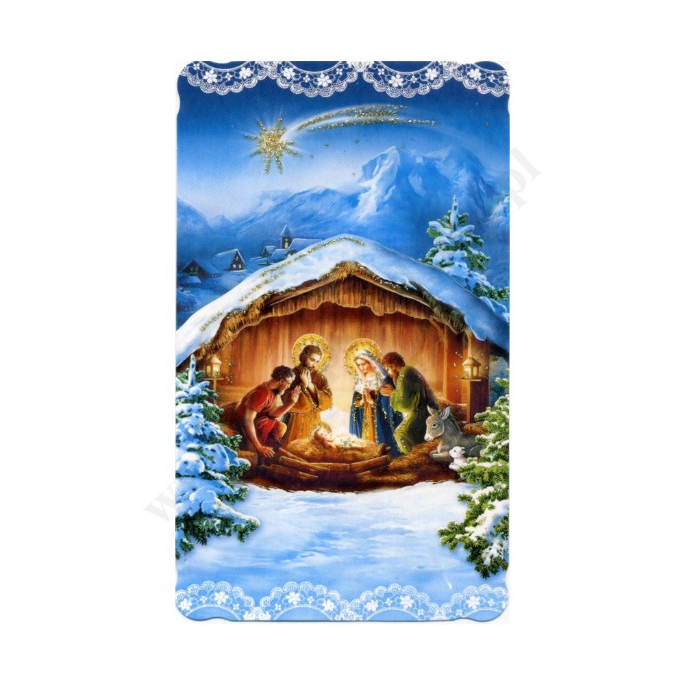 Obrazek kolędowy lakierowany, zdobiony brokatem o wymiarach 6.2 cm x 10.5 cm. Na rewersie obrazka pamiątkowy tekst. W paczce znajduje się 100 szt. obrazków jednego wzoru. Sprzedaż na paczki po 100 szt.