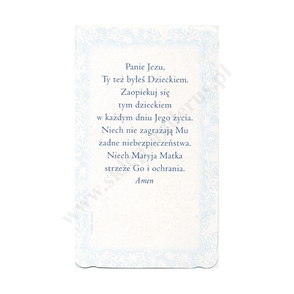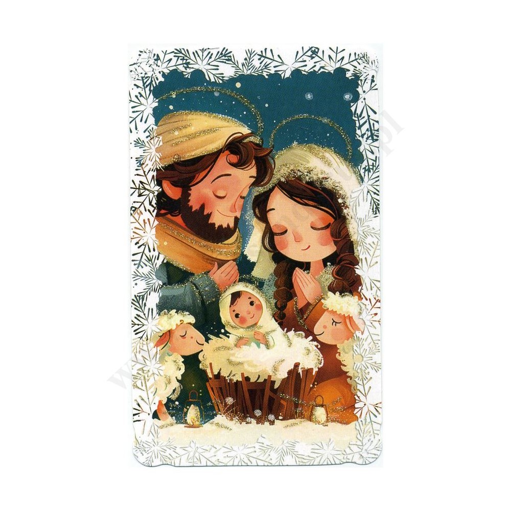 Obrazek kolędowy lakierowany, zdobiony brokatem o wymiarach 6.2 cm x 10.5 cm. Na rewersie obrazka pamiątkowy tekst. W paczce znajduje się 100 szt. obrazków jednego wzoru. Sprzedaż na paczki po 100 szt.