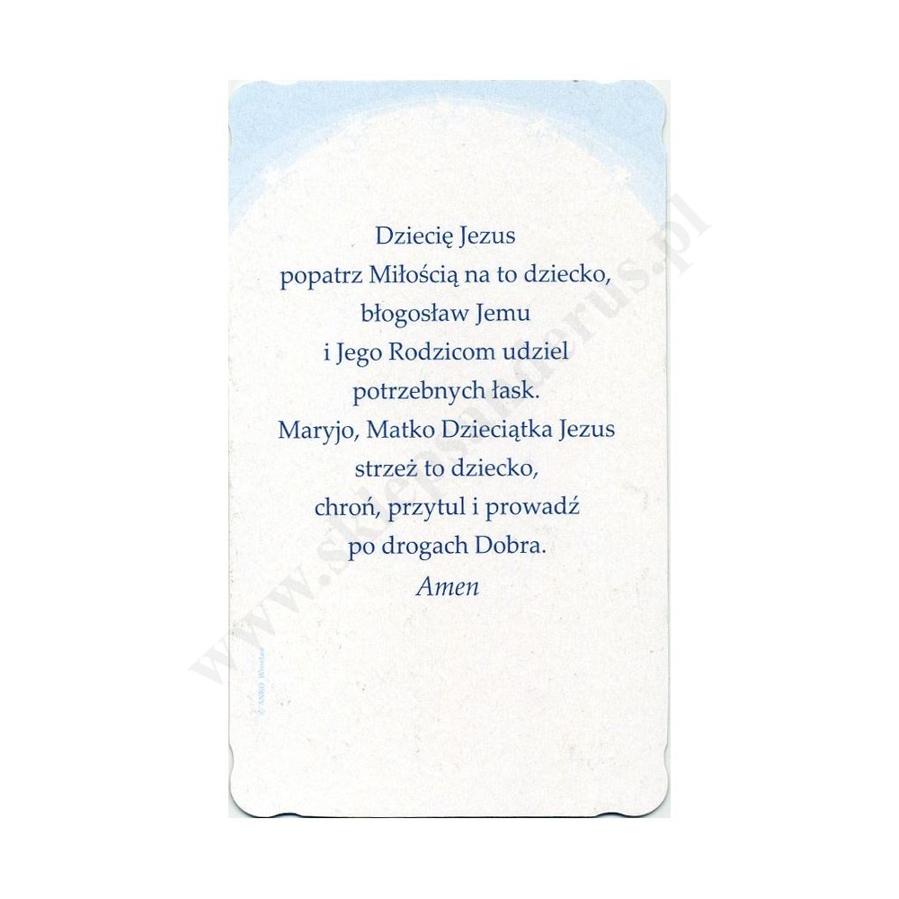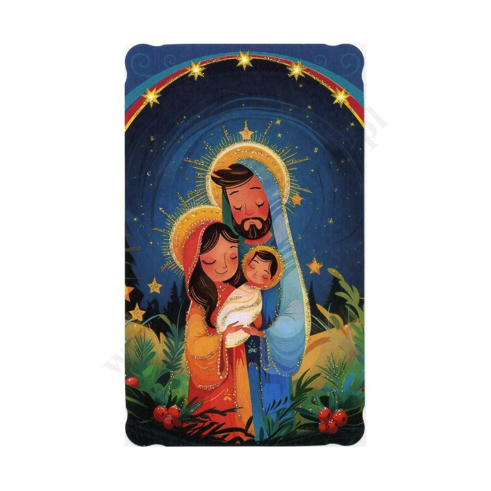 Obrazek kolędowy lakierowany, zdobiony brokatem o wymiarach 6.2 cm x 10.5 cm. Na rewersie obrazka pamiątkowy tekst. W paczce znajduje się 100 szt. obrazków jednego wzoru. Sprzedaż na paczki po 100 szt.