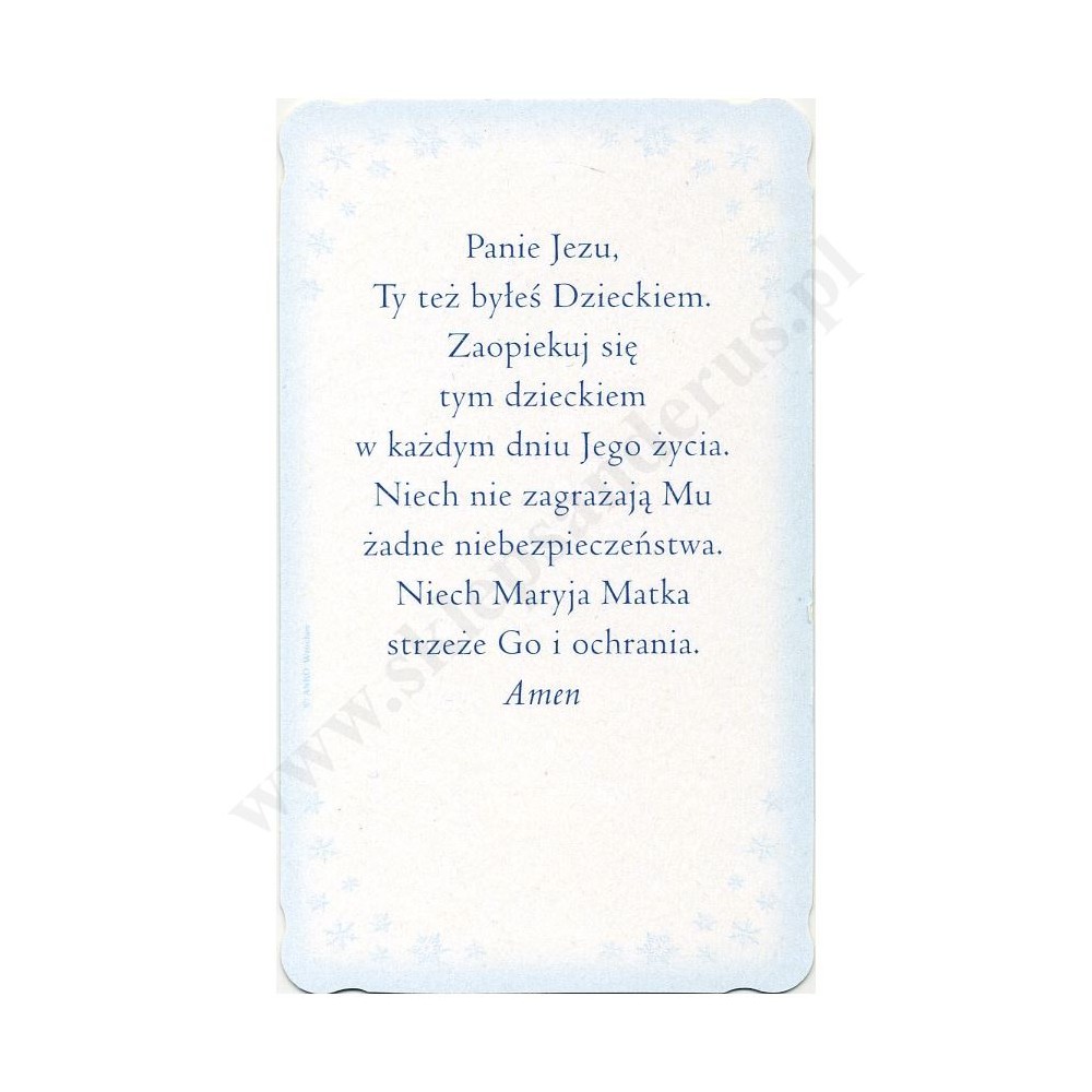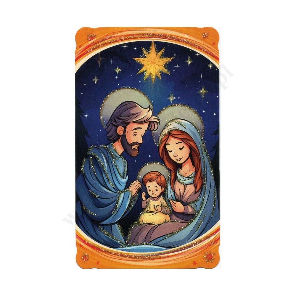 Obrazek kolędowy lakierowany, zdobiony brokatem o wymiarach 6.2 cm x 10.5 cm. Na rewersie obrazka pamiątkowy tekst. W paczce znajduje się 100 szt. obrazków jednego wzoru. Sprzedaż na paczki po 100 szt.