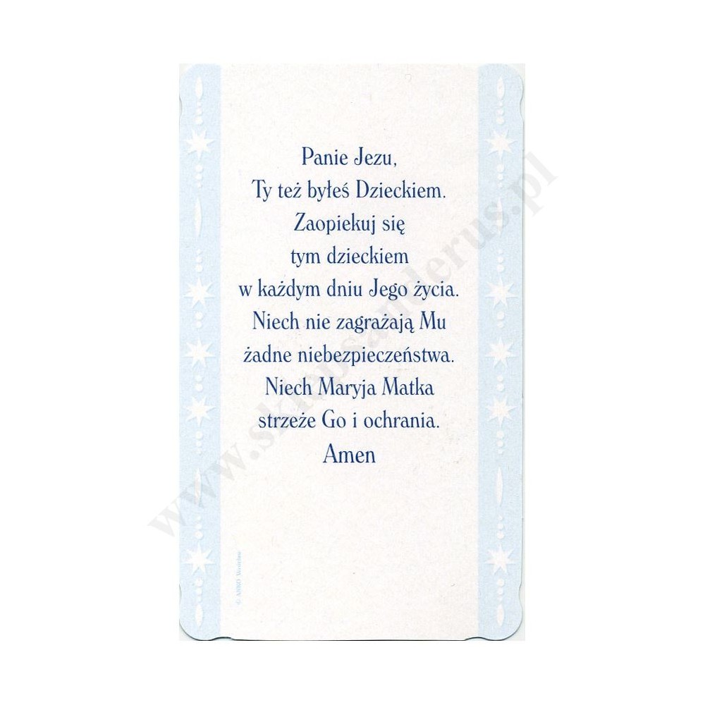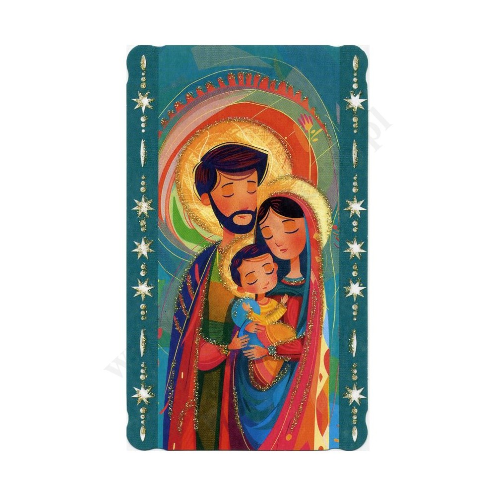 Obrazek kolędowy lakierowany, zdobiony brokatem o wymiarach 6.2 cm x 10.5 cm. Na rewersie obrazka pamiątkowy tekst. W paczce znajduje się 100 szt. obrazków jednego wzoru. Sprzedaż na paczki po 100 szt.
