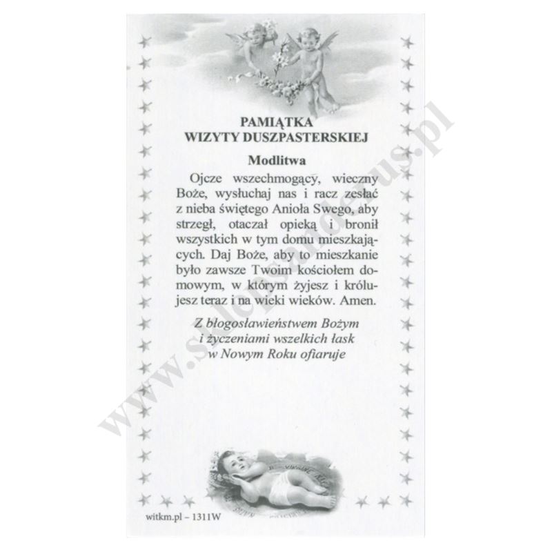 Obrazek kolędowy lakierowany o wymiarach 6.7 x 11.8 cm. Na rewersie obrazka pamiątkowy tekst. W paczce znajduje się 100 szt. obrazków jednego wzoru.