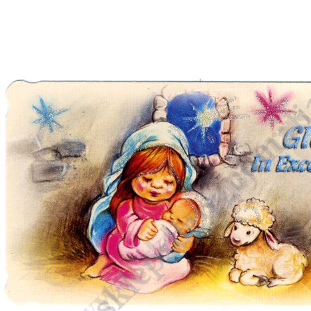 Obrazek kolędowy brokatowany w formacie 11.7 x 6.5 cm na rewersie obrazka pamiątkowy tekst. Sprzedaż na paczki po 100 szt.