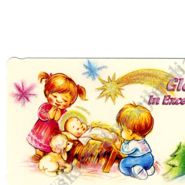 Obrazek kolędowy brokatowany w formacie 11.7 x 6.5 cm na rewersie obrazka pamiątkowy tekst. Sprzedaż na paczki po 100 szt.