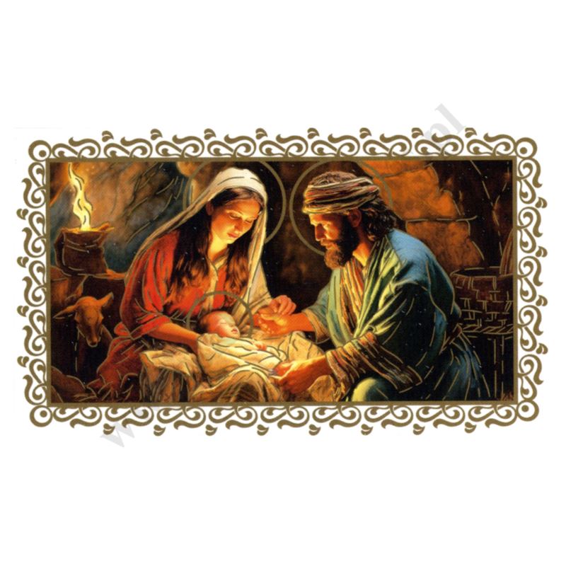 Obrazek kolędowy lakierowany wymiarach 11 cm x 6.5 cm, na rewersie obrazka tekst błogosławieństwa kolędowego. Sprzedaż w paczkach po 100 szt.