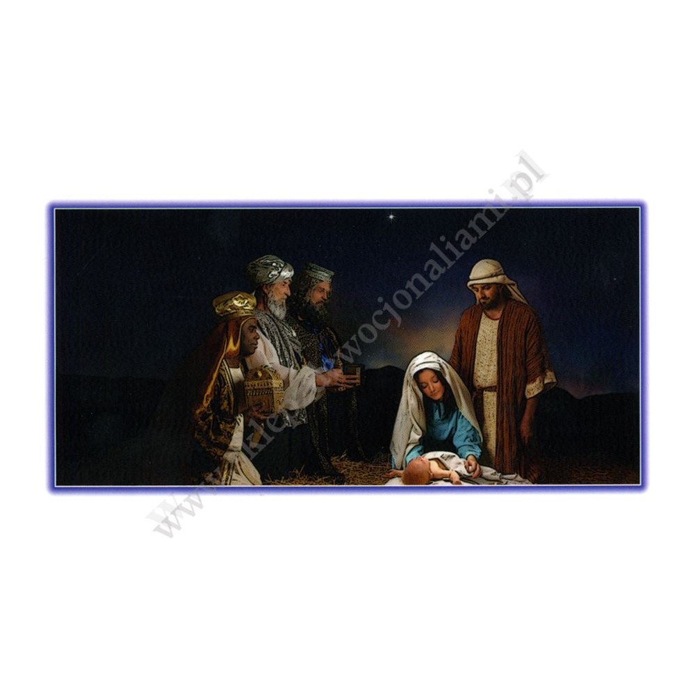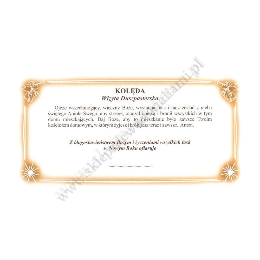 Obrazek kolędowy lakierowany wymiarach 14 cm x 7 cm, na rewersie obrazka tekst błogosławieństwa kolędowego. Sprzedaż w paczkach po 100 szt.