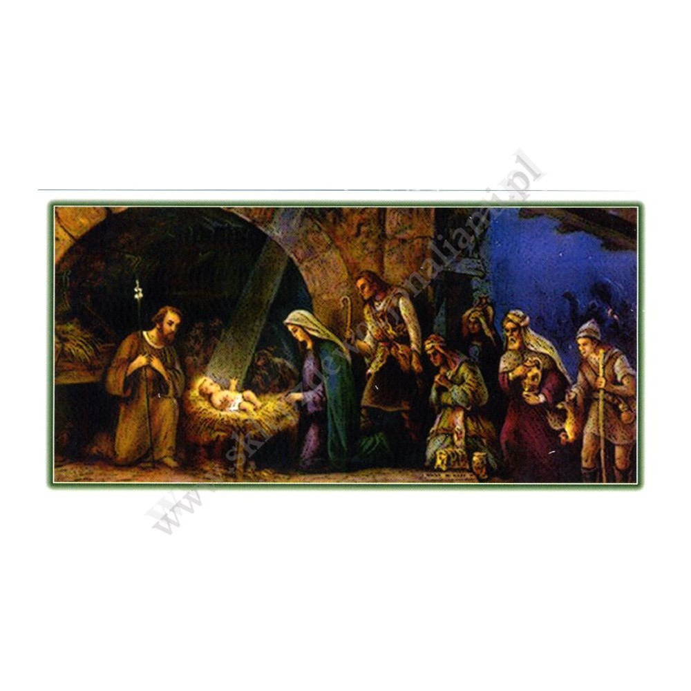 Obrazek kolędowy lakierowany wymiarach 14 cm x 7 cm, na rewersie obrazka tekst błogosławieństwa kolędowego. Sprzedaż w paczkach po 100 szt.