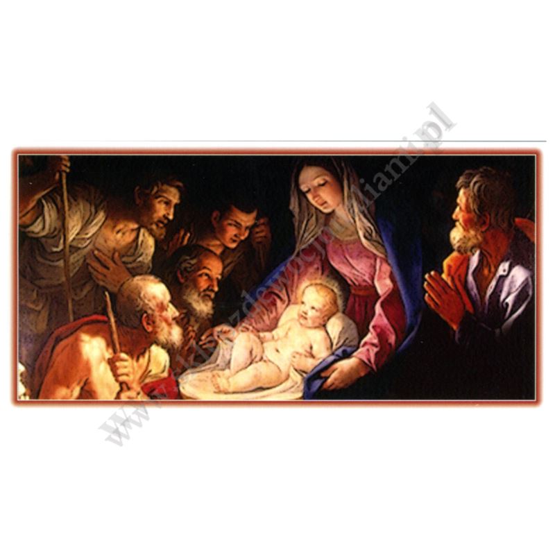 Obrazek kolędowy lakierowany wymiarach 14 cm x 7 cm, na rewersie obrazka tekst błogosławieństwa kolędowego. Sprzedaż w paczkach po 100 szt.