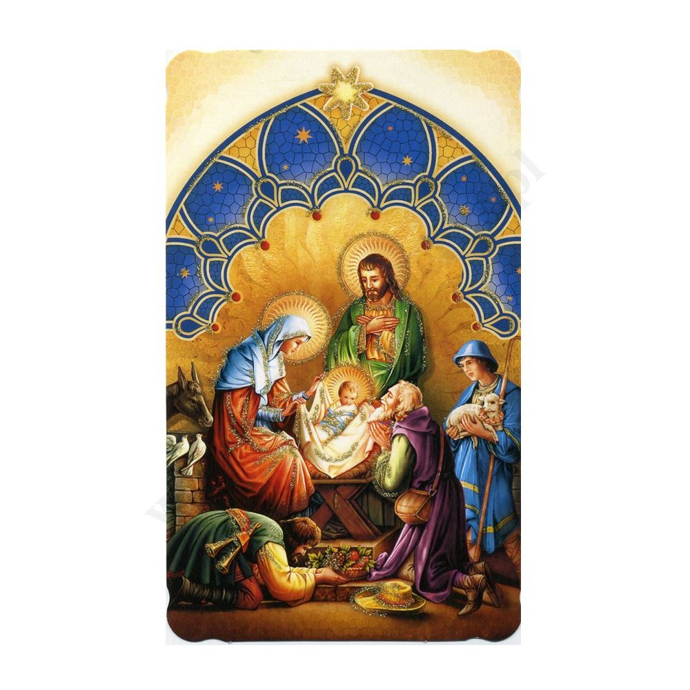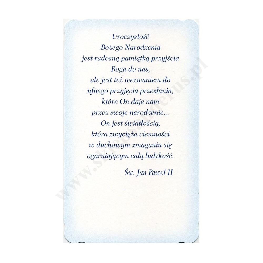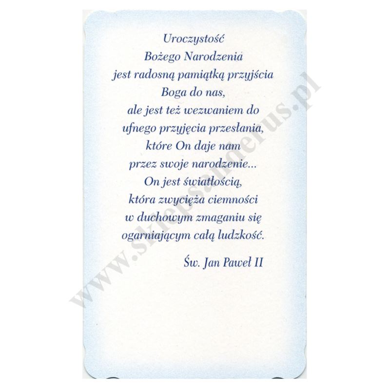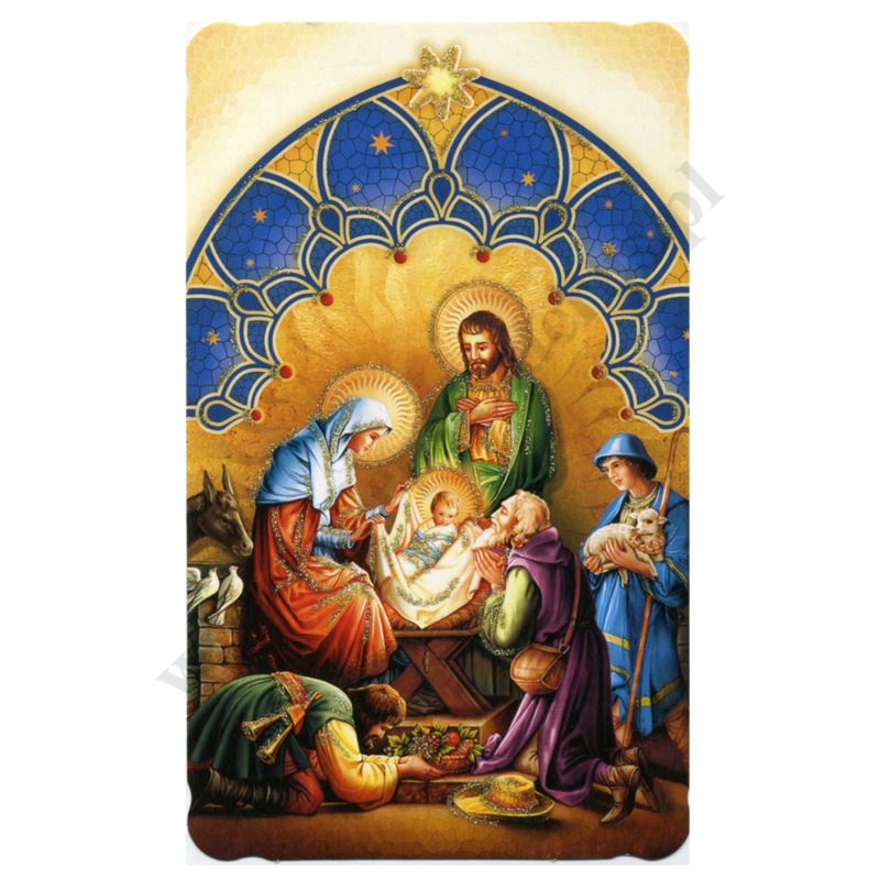 Obrazek kolędowy lakierowany, zdobiony brokatem w formacie pocztówki o wymiarach 8.9 cm x 14.8 cm. Na rewersie obrazka pamiątkowy tekst. W paczce znajduje się 100 szt. obrazków jednego wzoru.