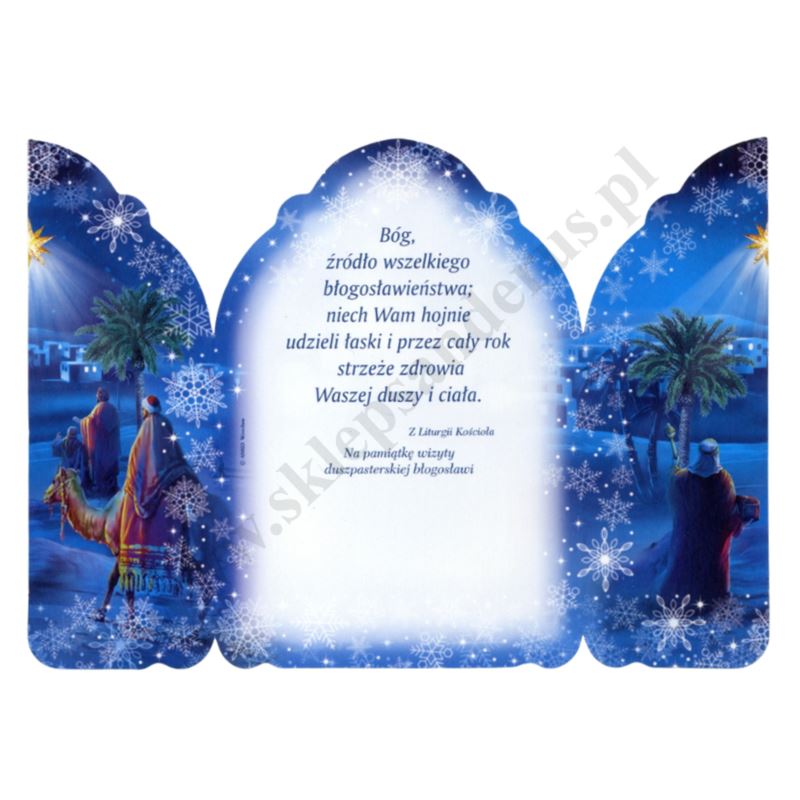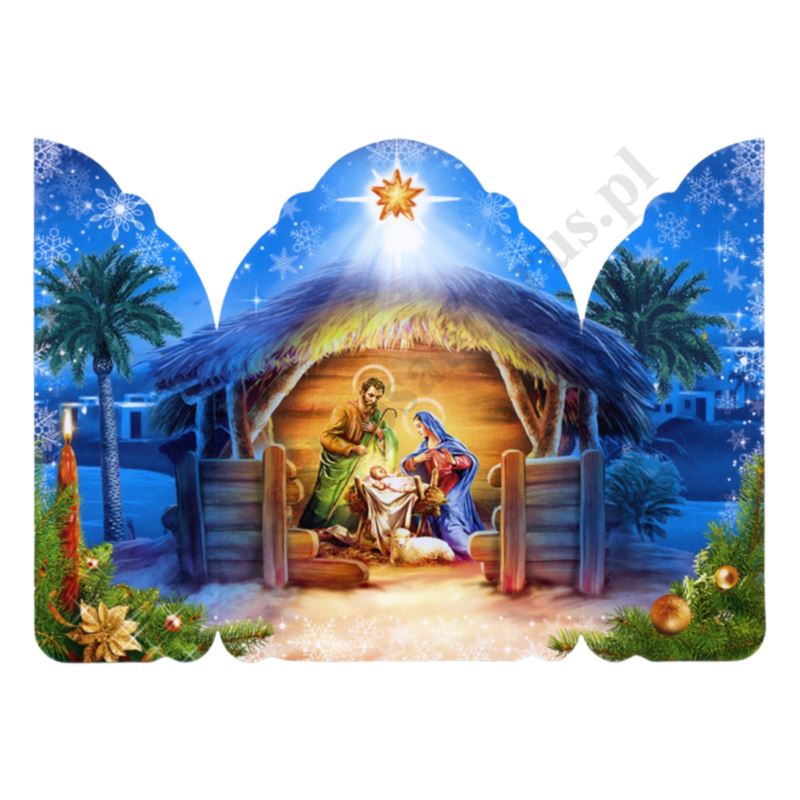 Obrazek kolędowy w postaci składanego tryptyku. Wymiary po rozłożeniu: szerokość 15,2 cm, wysokość 11 cm. Sprzedaż w paczkach po 100 szt.