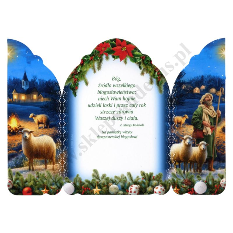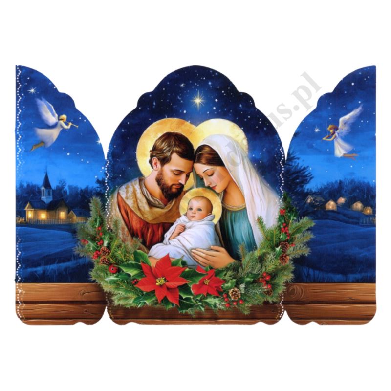 Obrazek kolędowy w postaci składanego tryptyku. Wymiary po rozłożeniu: szerokość 15,2 cm, wysokość 11 cm. Sprzedaż w paczkach po 100 szt.