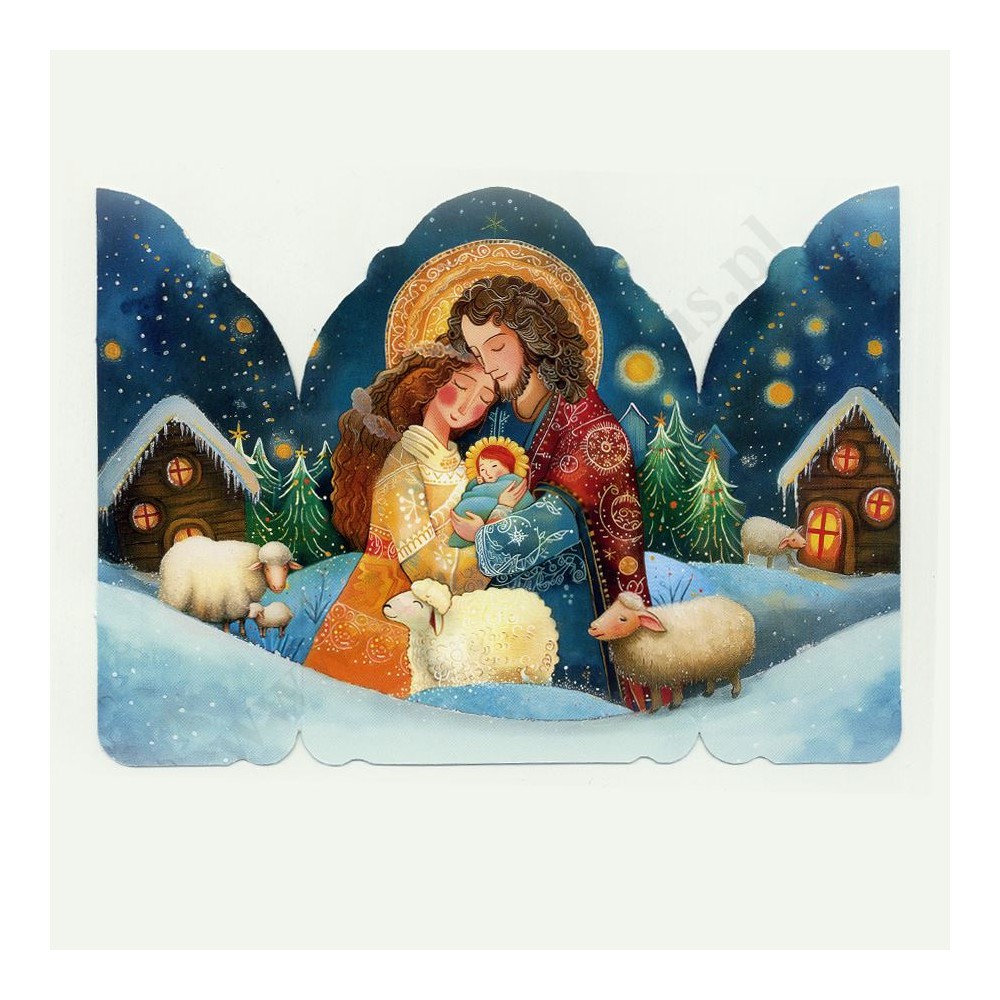 Obrazek kolędowy w postaci składanego tryptyku. Wymiary po rozłożeniu: szerokość 15 cm, wysokość 11 cm. Sprzedaż w paczkach po 100 szt.