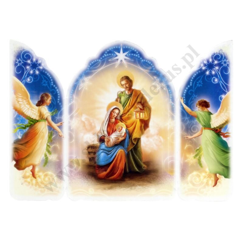 Obrazek kolędowy w postaci składanego tryptyku. Wymiary po rozłożeniu: szerokość 15 cm, wysokość 11 cm. Sprzedaż w paczkach po 100 szt.