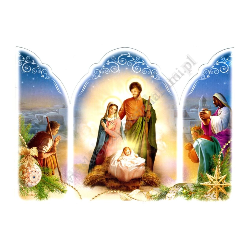Obrazek kolędowy w postaci składanego tryptyku. Wymiary po rozłożeniu: szerokość 15,2 cm, wysokość 11 cm. Sprzedaż w paczkach po 100 szt.