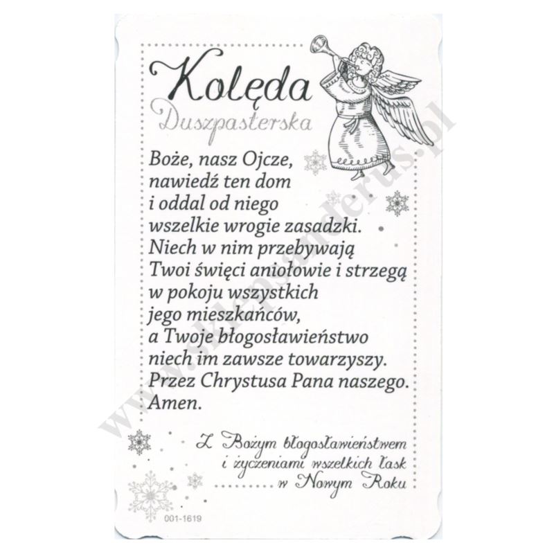 Obrazek kolędowy lakierowany o wymiarach 6.5 x 10.5 cm. Na rewersie obrazka pamiątkowy tekst. W paczce znajduje się 100 szt. obrazków jednego wzoru. Sprzedaż na paczki po 100 szt.