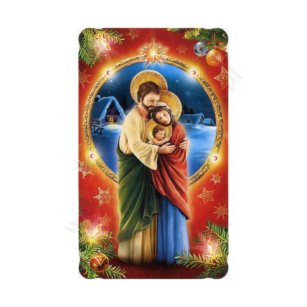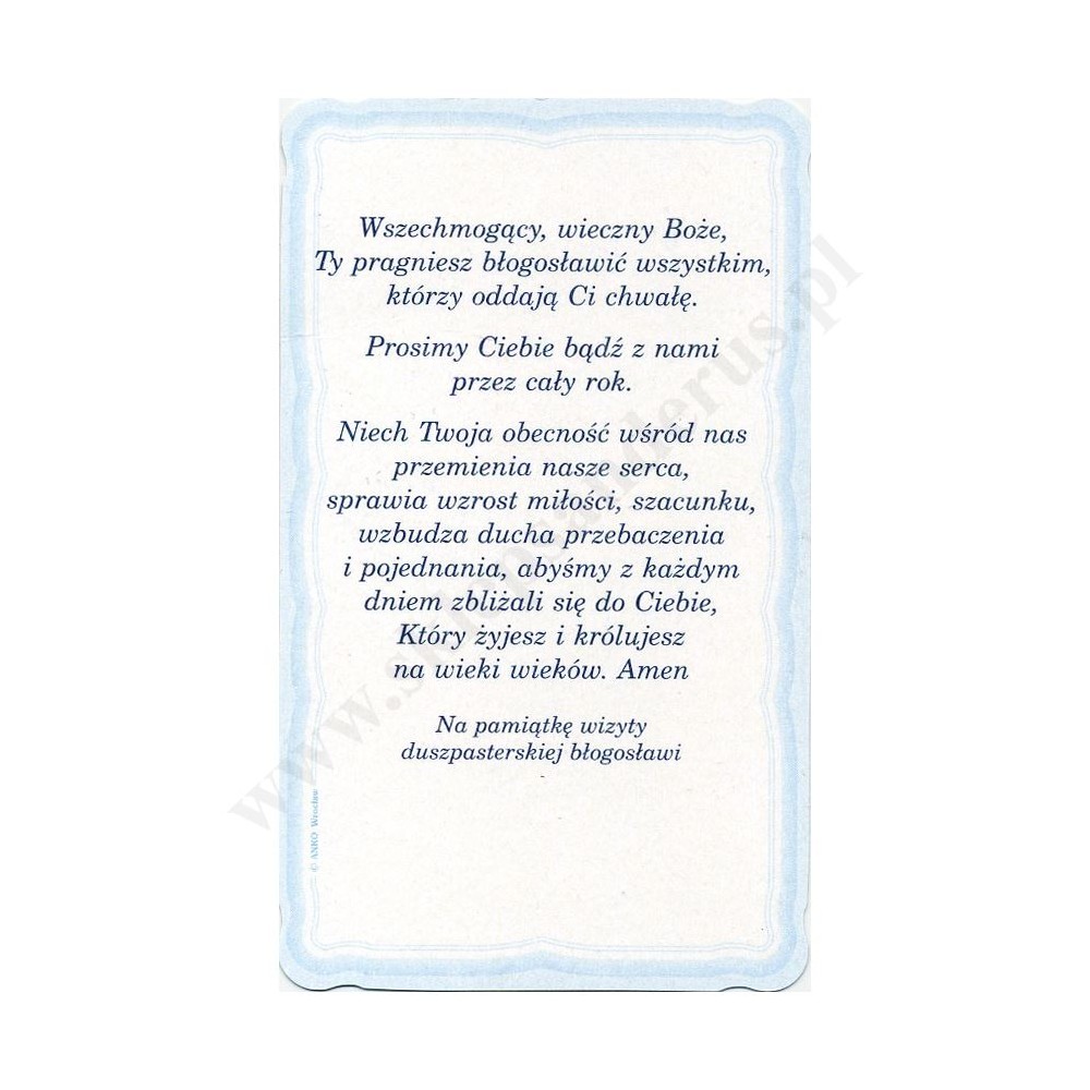Obrazek kolędowy lakierowany o wymiarach 6,2 cm x 10.5 cm. Na rewersie obrazka pamiątkowy tekst. W paczce znajduje się 100 szt. obrazków jednego wzoru. Sprzedaż na paczki po 100 szt.