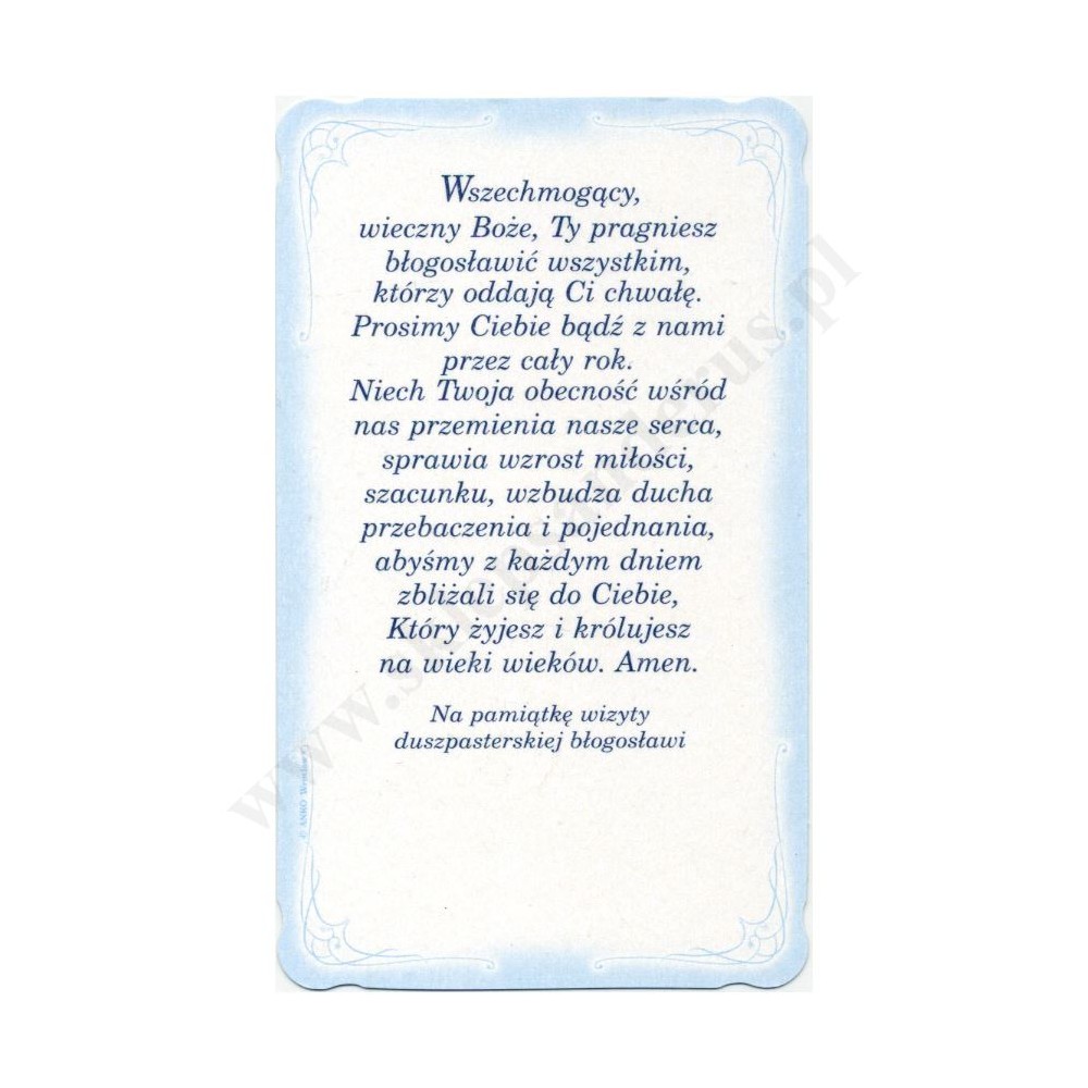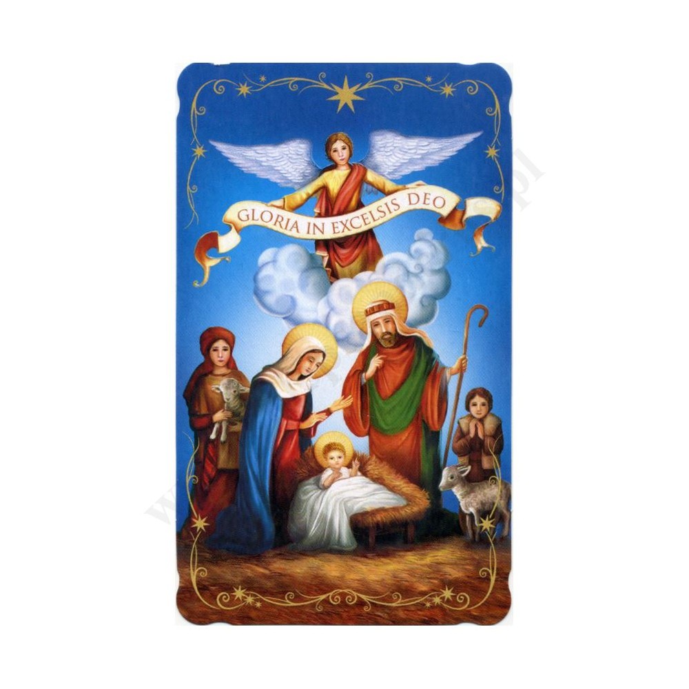 Obrazek kolędowy lakierowany o wymiarach 6,2 cm x 10.5 cm. Na rewersie obrazka pamiątkowy tekst. W paczce znajduje się 100 szt. obrazków jednego wzoru. Sprzedaż na paczki po 100 szt.
