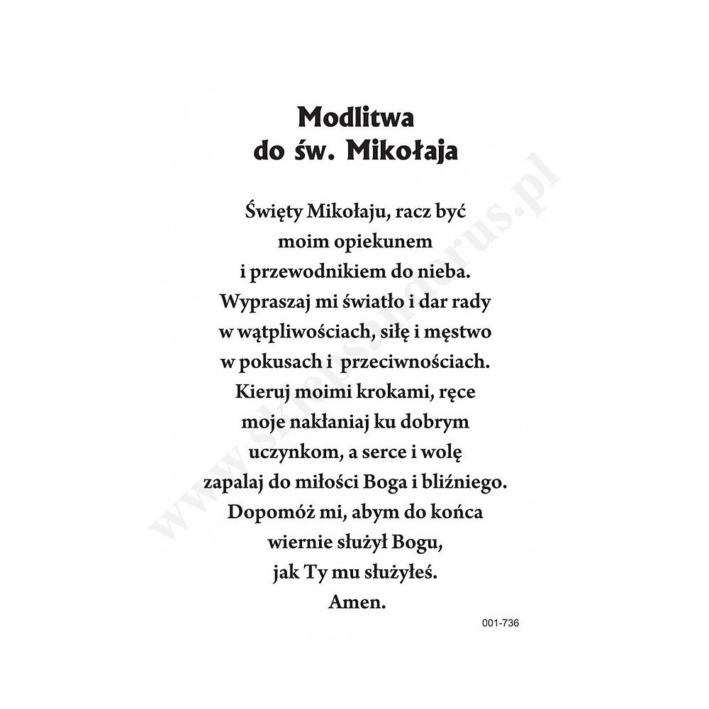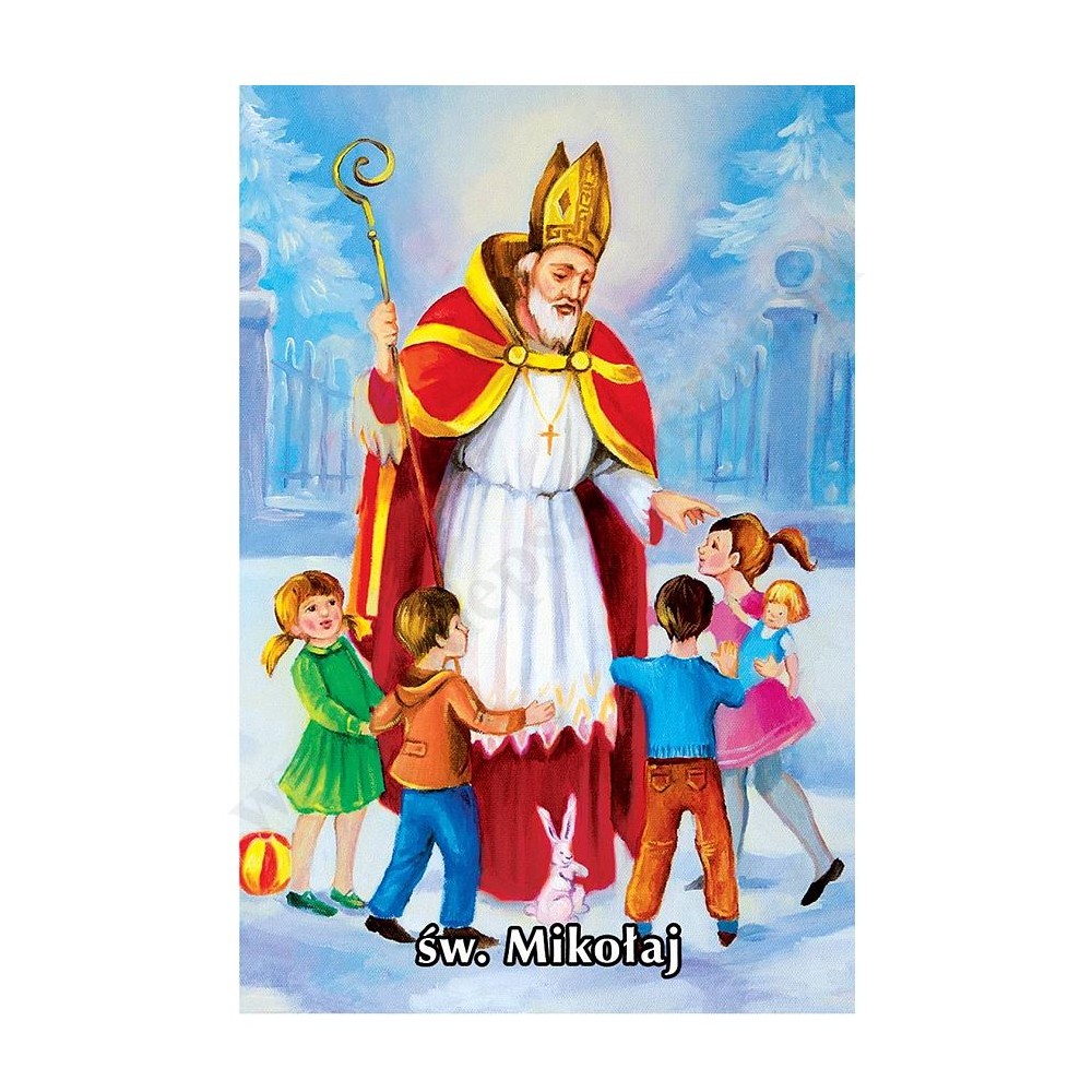 Obrazek kolędowy Świętego Mikołaja o wymiarach 6.4 x 10 cm. Na rewersie obrazka tekst modlitwy do Świętego Mikołaja. W paczce znajduje się 100 szt. obrazków jednego wzoru. Sprzedaż na paczki po 100 szt.