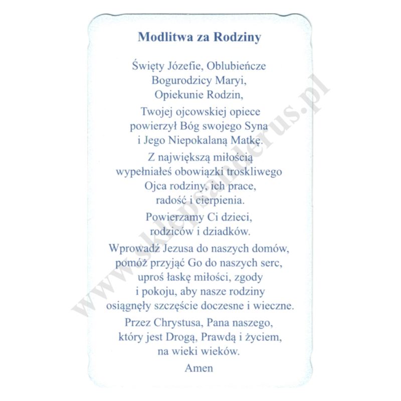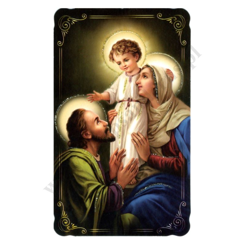 Obrazek Świętej Rodziny, lakierowany i brokatowany w formacie 6.5 x 10.5 cm z modlitwą za rodziny na rewersie. Sprzedaż w paczce po 100 szt.