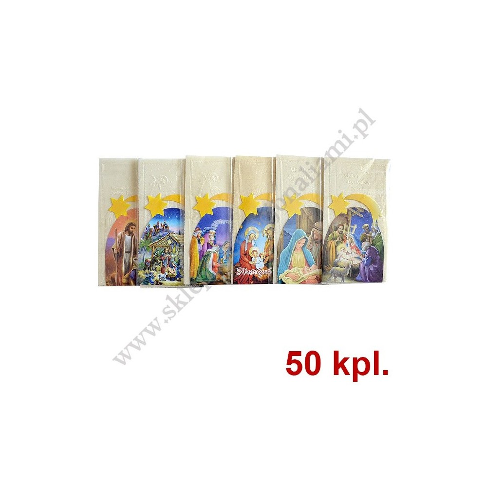 50 KOMPLETÓW. Komplet opłatków wigilijnych składający się z trzech dużych opłatków oraz jednego dużego kolorowego (dla zwierząt), format opłatków 10 x 18 cm, pakowane w folijce z kolorowym obrazkiem bożonarodzeniowym.